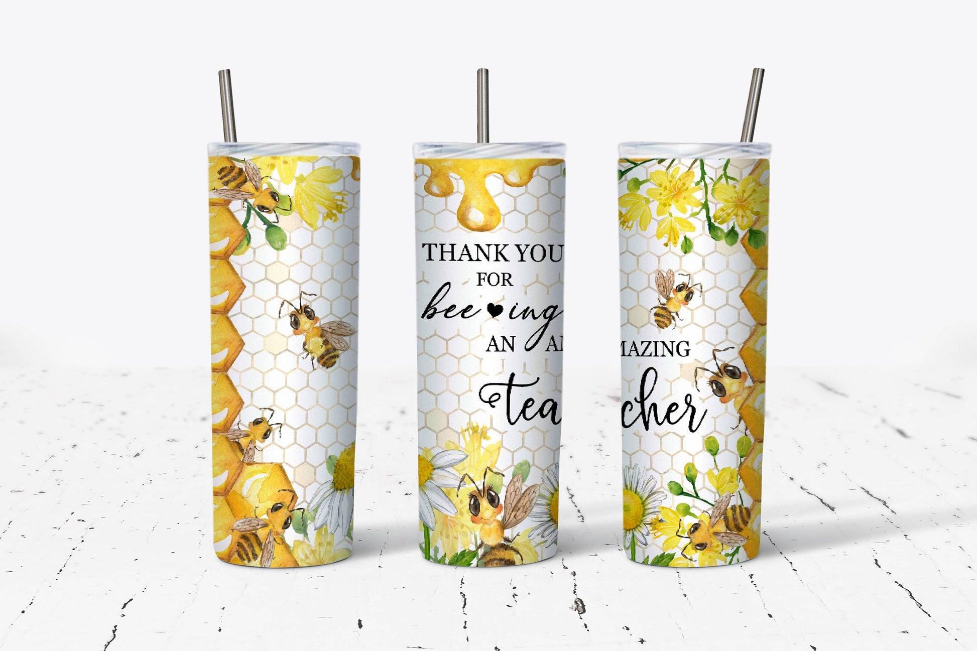 Celebrate the educators who make a buzz in the classroom with this charming 20oz stainless steel tumbler. Double-wall insulation keeps beverages at the perfect temperature, whether it's steaming coffee or ice-cold refreshment. The secure slide-locking lid and included straw make sipping on the go effortless. Featuring a vibrant bee-themed design applied through premium heat transfer technology, this handcrafted tumbler is built to last. Hand wash to preserve the artwork's brilliance season after season. A thoughtful gift that shows teachers they're truly appreciated.