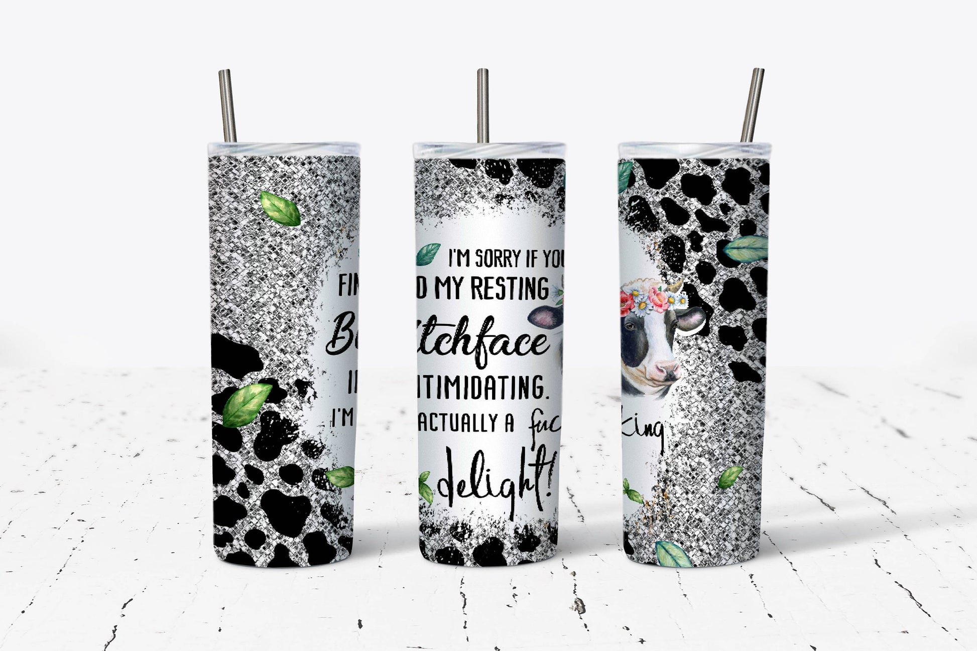 Rock your attitude with this bold 20oz stainless steel tumbler featuring edgy cow print and a cheeky message. Double-walled construction keeps your beverages at the perfect temperature, whether you're sipping hot coffee or ice-cold drinks. Includes a secure slide-lock lid and sustainable metal straw for eco-conscious sipping. Hand wash to maintain vibrant colors and lasting quality. Each piece is handcrafted and made to order, so minor variations add to its unique charm.
